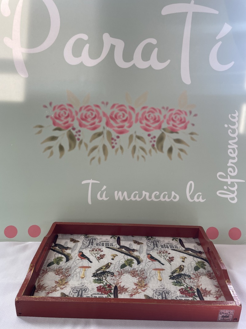 Bandeja de madera con 2 asas, decorada a mano con la técnica de decoupage. Modelo autumn ardilla combinado con tono teja. Base interior acristalada. Apto para lavado a mano. 40cm X 24cm
