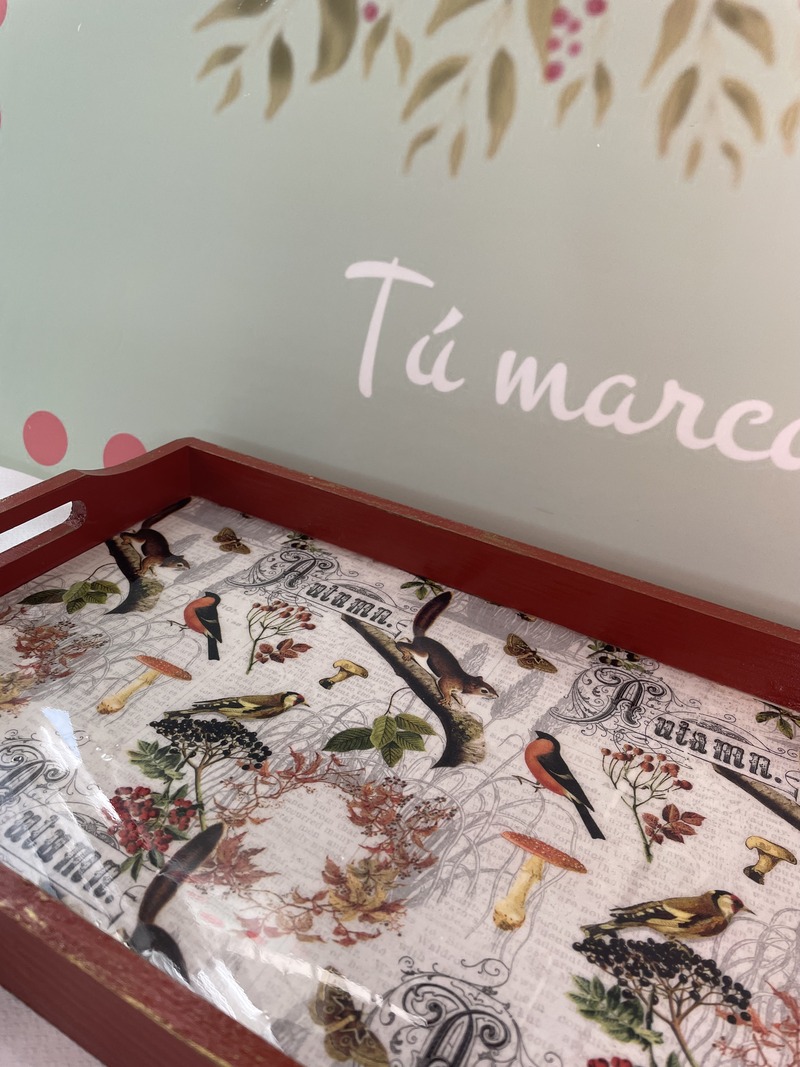 • Uso decorativo recomendado: si se utilizan como platos decorativos o bandejas, procura no colocar objetos demasiado pesados para mantener intacto el acabado en decoupage.