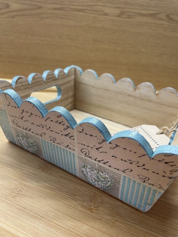 Cesta de madera con blonda, con asas de riñón. Decorada a mano con la técnica de decoupage. Modelo lunares. Base interior barnizada. Apto para lavado a mano. 16cm X 16cm.