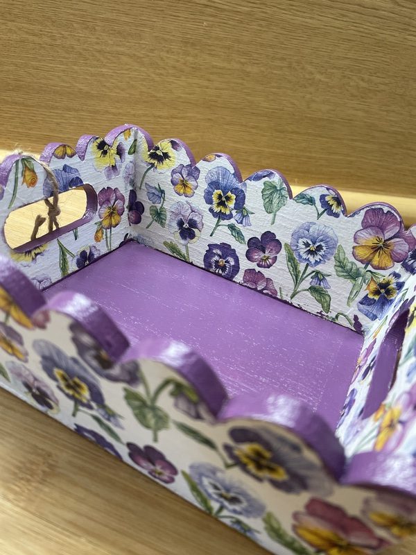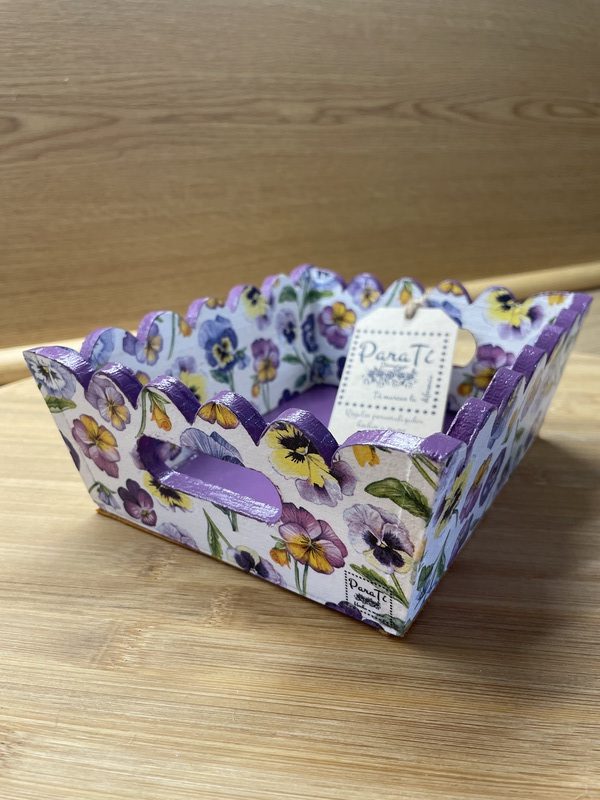 Cesta de madera con blonda, con asas de riñón. Decorada a mano con la técnica de decoupage. Modelo pensamientos. Base interior barnizada. Apto para lavado a mano. 16cm X 16cm.