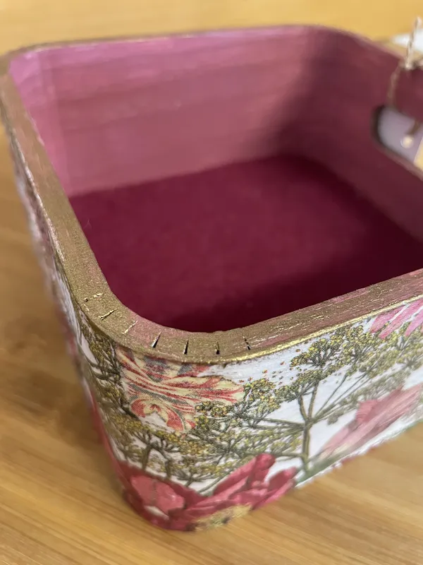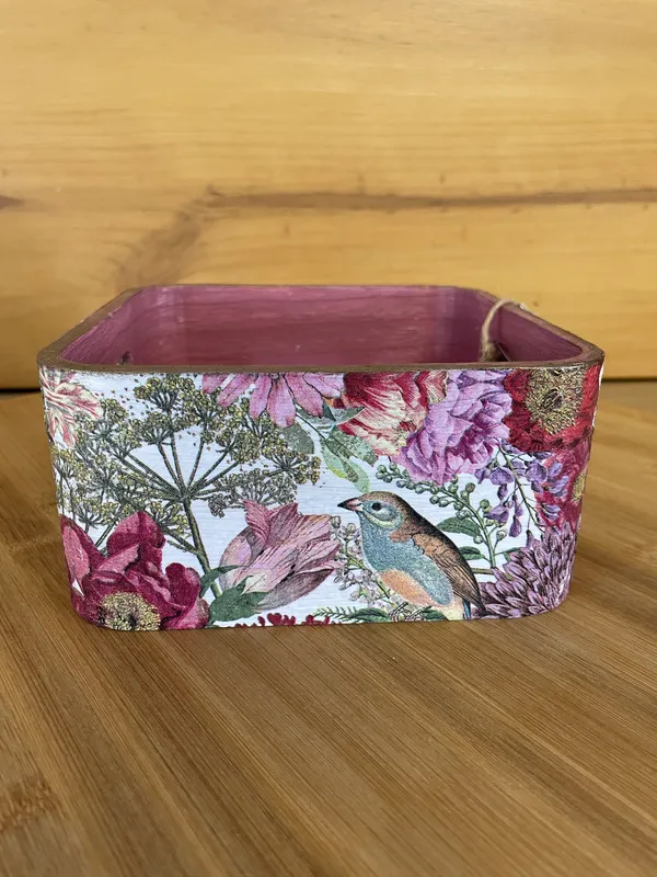Esta bonita cesta de madera decorada con decoupage es una creación artesanal que combina funcionalidad y diseño. Cada detalle ha sido trabajado a mano con la delicada técnica del decoupage, que aporta color, originalidad y un acabado exclusivo a la madera natural. Tamaño