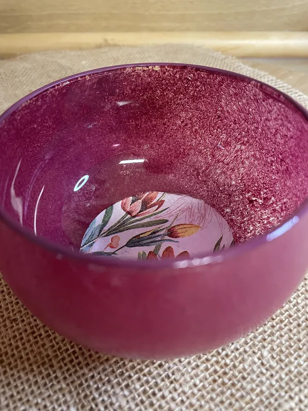 Cuenco de cristal redondo. Personalízalo a tu gusto con nuestros diseños. Apto para alimentos y lavado a mano. 9,5 cm de diámetro y 5,5cm de altura aprox.