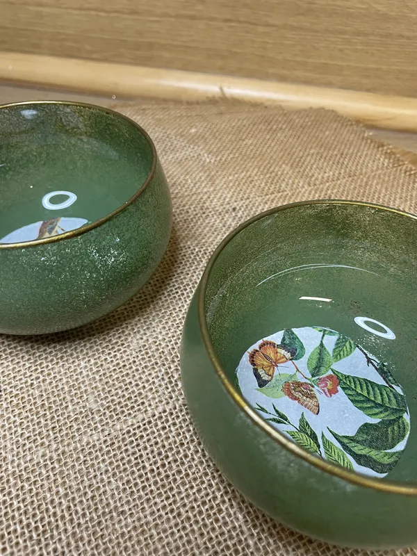 Cuenco de cristal redondo. Modelo entre ramas combinado con tonos verdes y dorados. Apto para alimentos y lavado a mano. 9,5 cm de diámetro y 5,5cm de altura aprox.