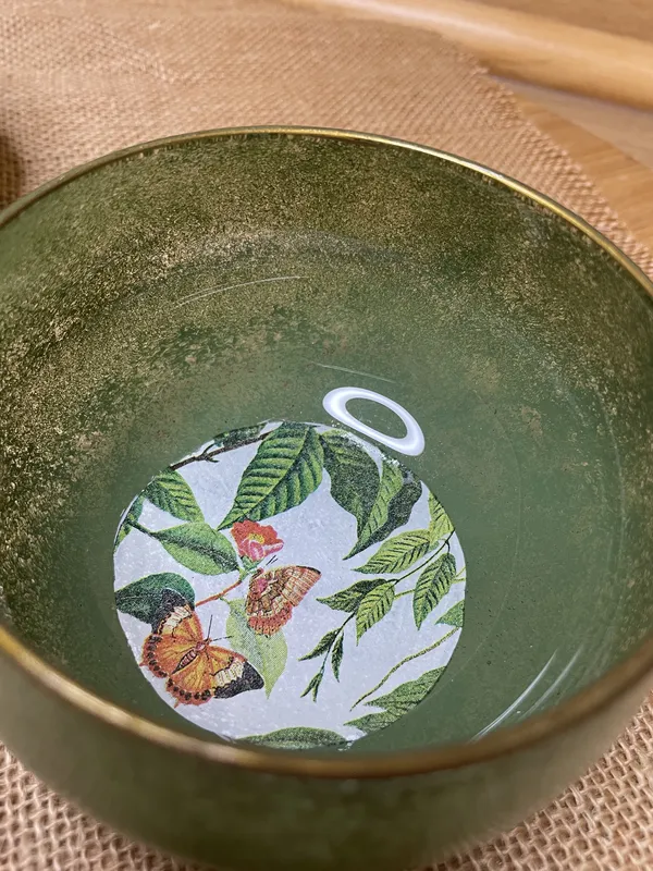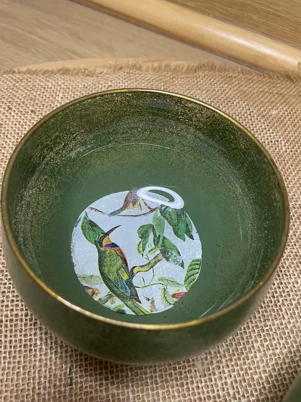 Cuenco de cristal redondo. Modelo entre ramas combinado con tonos verdes y dorados. Apto para alimentos y lavado a mano.