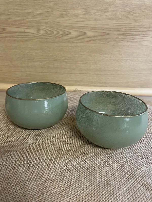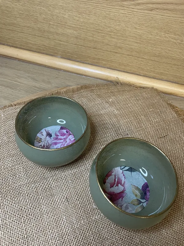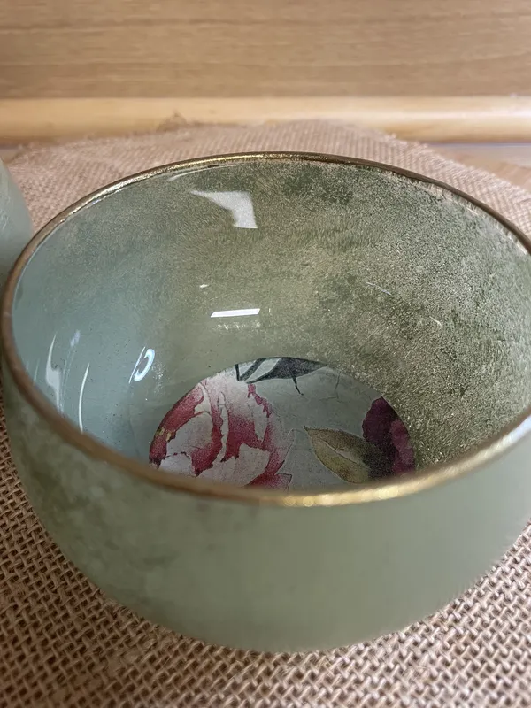 Cuenco de cristal redondo. Modelo peonía verde vintage con tono verde. Apto para alimentos y lavado a mano. 9,5 cm de diámetro y 5,5cm de altura aprox.