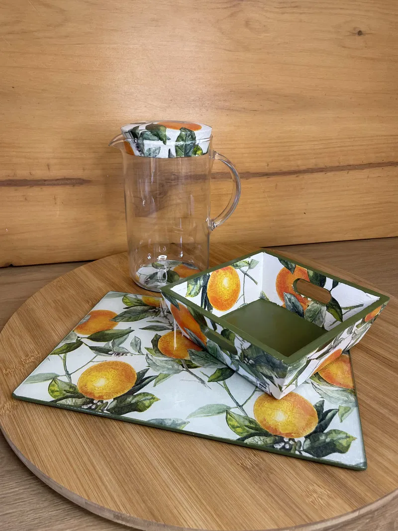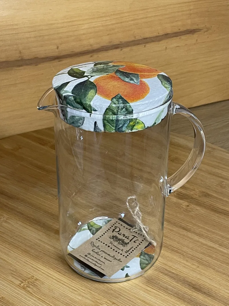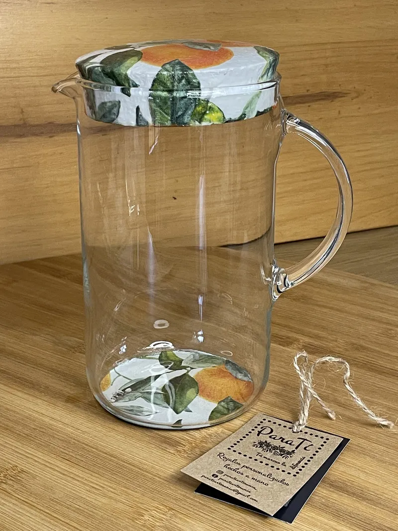 Jarra con asa de cristal con tapón de corcho y base decorada a mano con la técnica de decoupage e impermeabilizada. Apto para lavar a mano.. Este producto artesanal está cuidadosamente elaborado con técnicas de decoración como el decoupage, aportando un estilo único y original a tu hogar. Cada pieza es hecha a mano, lo que garantiza exclusividad y un acabado de calidad. Ideal para quienes buscan artículos de artesanía, decoración y diseño exclusivo, perfectos para regalar o para dar un toque especial a cualquier espacio.