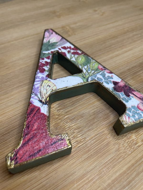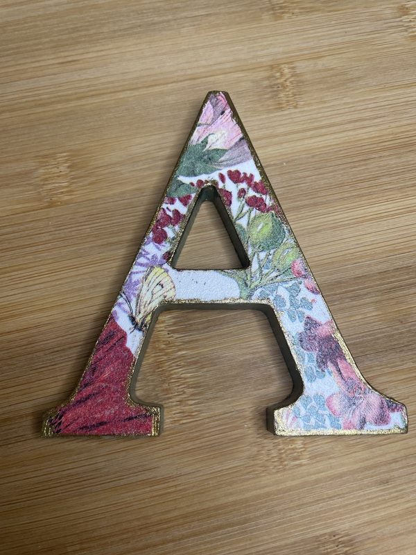Letra de madera A decorada a mano con la técnica de decoupage. Modelo rosas y pájaros con tono dorado. 11cm X 10cm