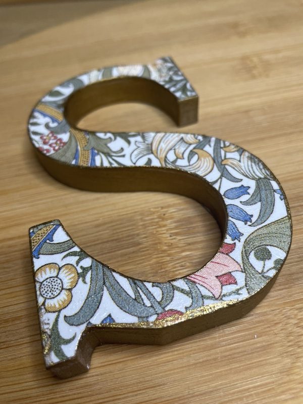 Letra de madera S decorada a mano con la técnica de decoupage. Modelo flores filigrana combinado con tono dorado. 11cm X 10cm
