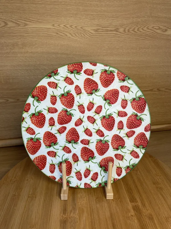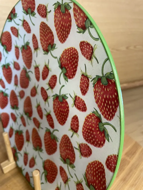 Plato o fuente de cristal redondo, decorada a mano con la técnica de decoupage. Acabado trasero con pintura y barniz. Filo al tono. Tamaño XL (29,5cm de diámetro). Lavar a mano.