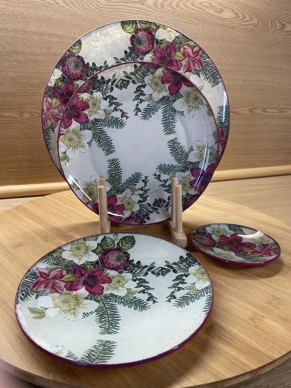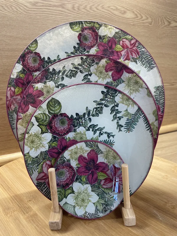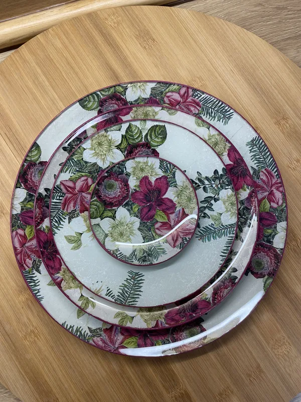 Plato o fuente de cristal redonda, decorada a mano con la técnica de decoupage con acabado trasero con pintura y barniz. Filo al tono. Tamaño S (11,5 cm diámetro) 10€, M (19,5cm de diametro) 13€, L (23,5cm de diametro) 17€ y XL (29,5cm de diámetro) 25€.