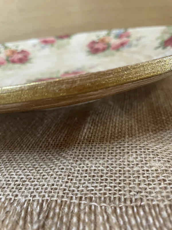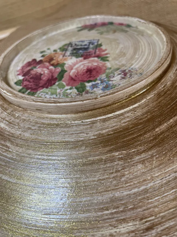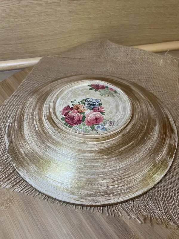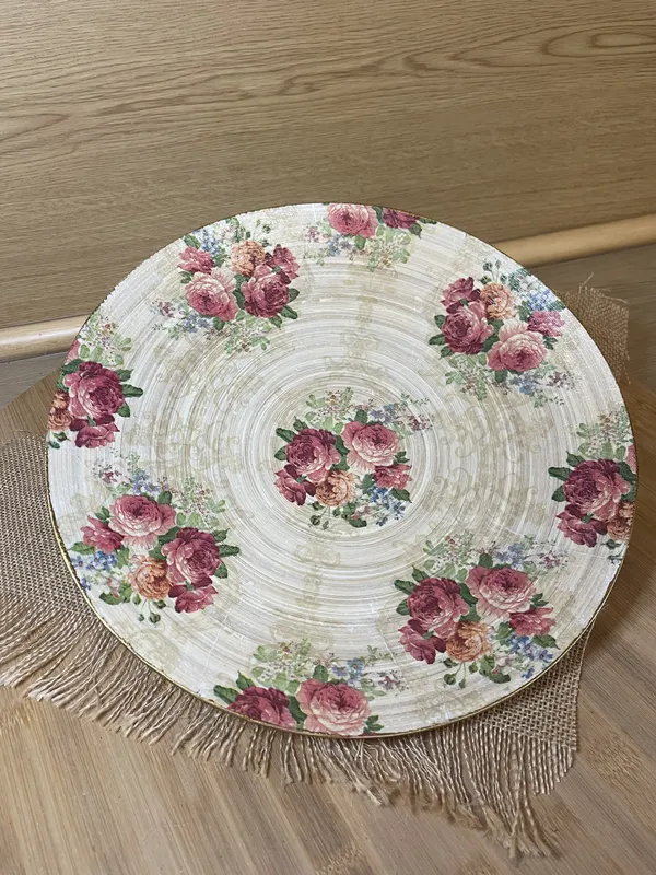 Plato redondo de madera, decorado a mano con la técnica de decoupage. Modelo azalea combinado con tono blanco roto. Trasera decapada blanco roto. Acabado barnizado. Apto para lavado a mano. 30cm de diámetro