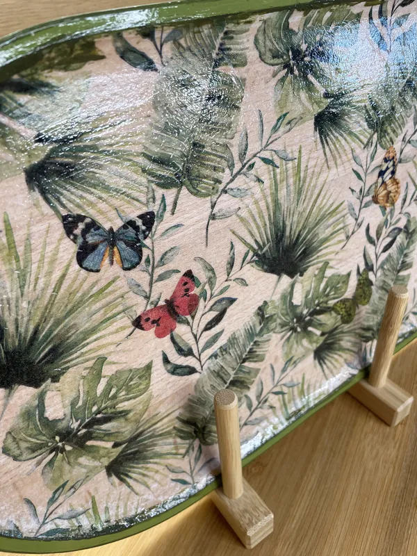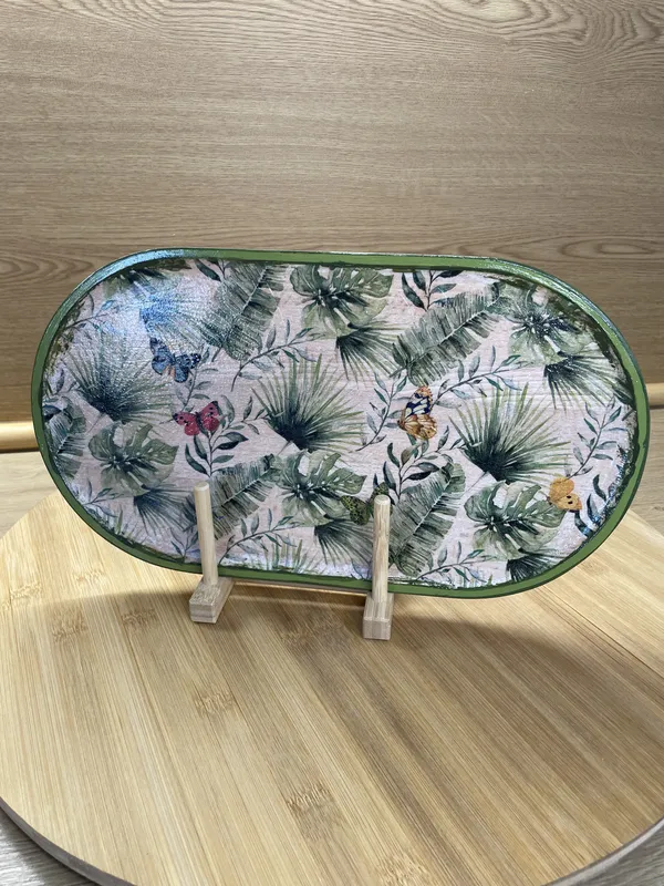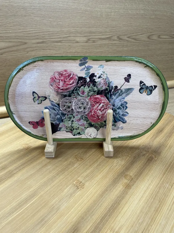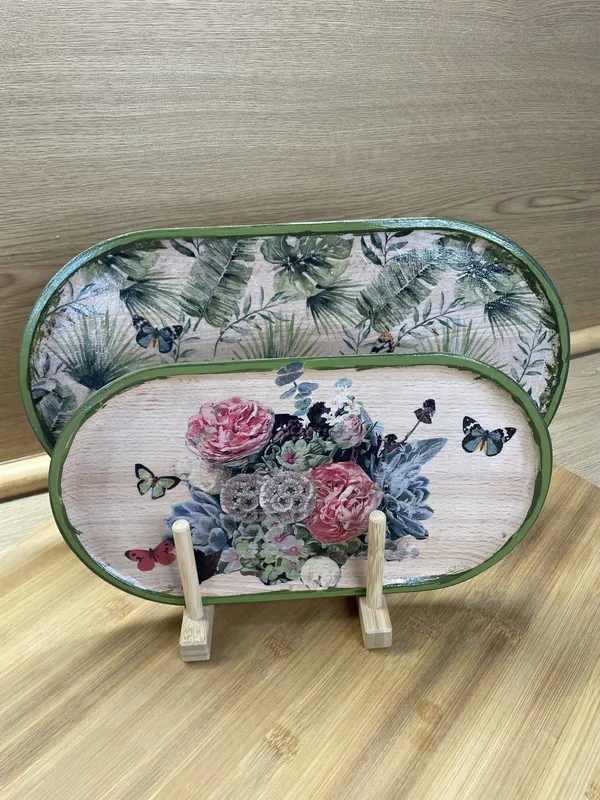 Set de bandejas de madera ovalada decoradas con la técnica de decoupage. Tamaño 28x15cm y 36x20cm.