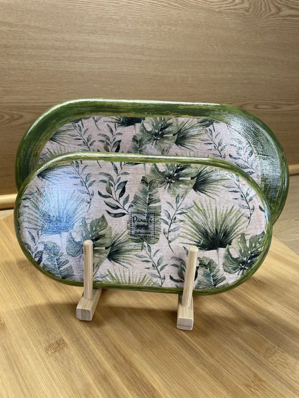 Este set de dos bandejas combina la versatilidad de diferentes tamaños con la belleza de la artesanía. Cada bandeja ha sido trabajada cuidadosamente a mano mediante la técnica de decoupage, lo que les confiere un acabado exclusivo y elegante.