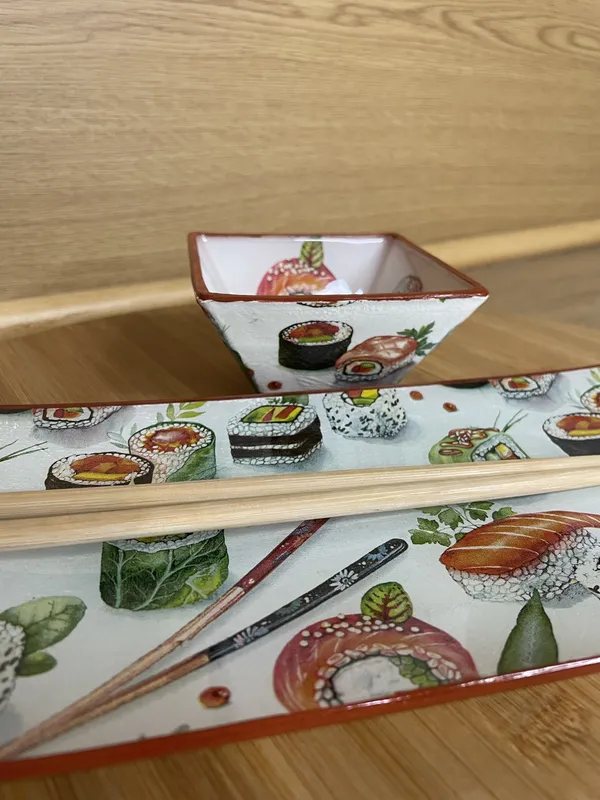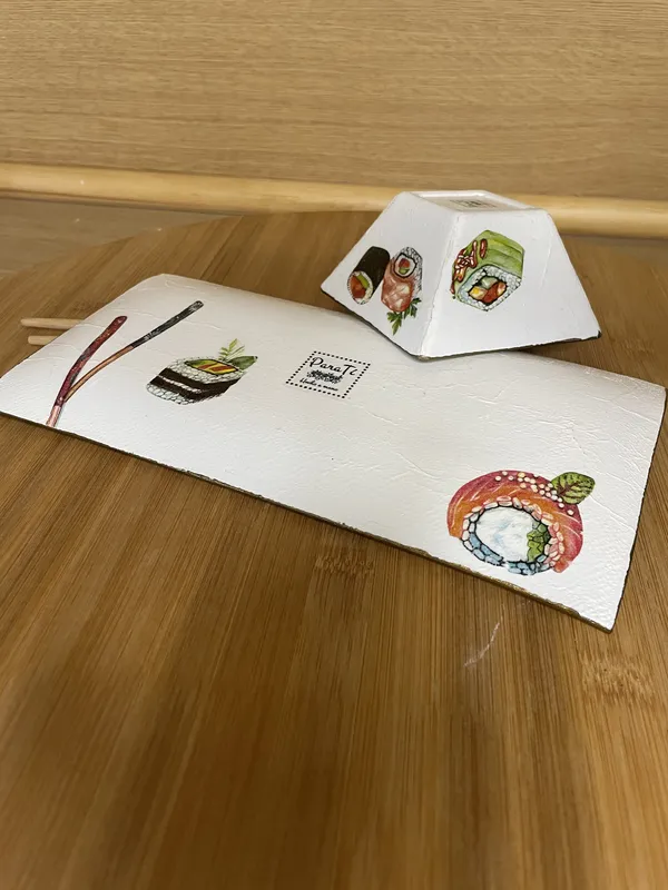 Este set de sushi artesanal combina elegancia y funcionalidad. Cada pieza está trabajada a mano con la técnica de decoupage, lo que convierte a la fuente de cristal en una pieza única y exclusiva. Sus acabados cuidados, disponibles con filo dorado o tono teja, aportan un toque sofisticado a la mesa y hacen que cada presentación de sushi o aperitivos luzca especial.