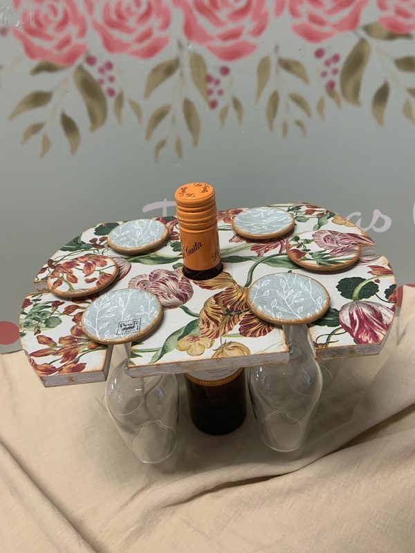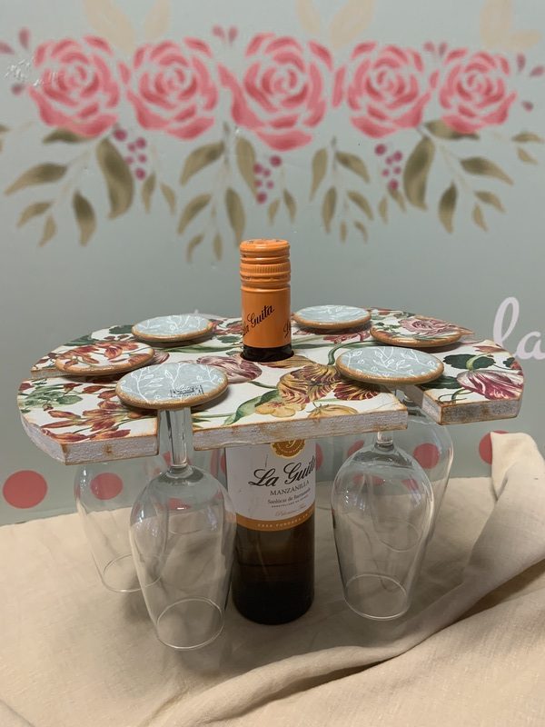 Soporte de madera para botella de fino/manzanilla y 6 catavinos. Decorado a mano con la técnica de decoupage. Catavinos de cristal de 15,5 cl decorados por ambos lados a juego. Apto para lavado a mano. 28cm X 20cm