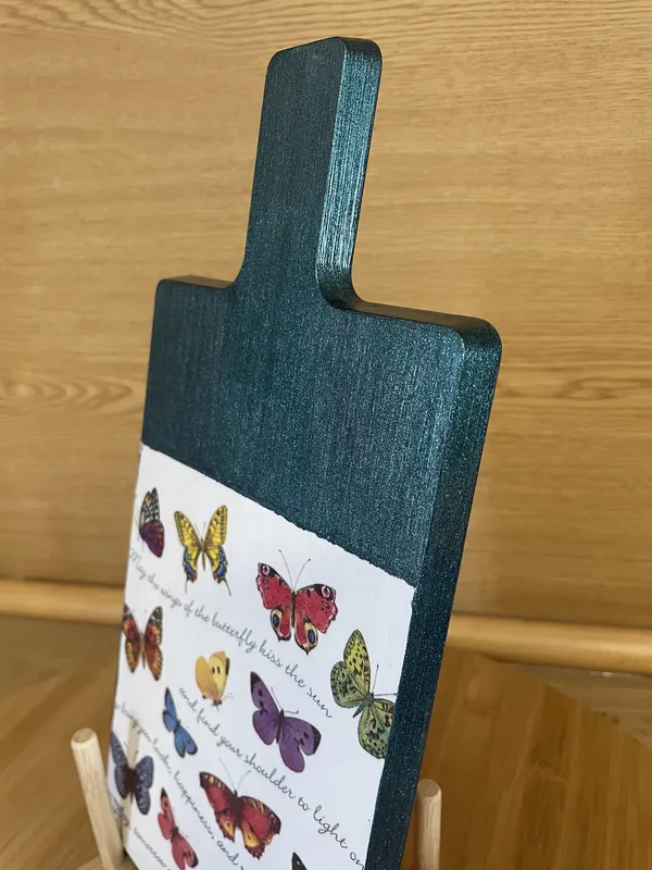 Tabla de madera decorada a mano con la técnica de decoupage. Modelo mariposas texto combinado con tono agua marina metalizado. Barnizada. Trasera de madera. Apto para lavado a mano. 30cm X 14,5cm