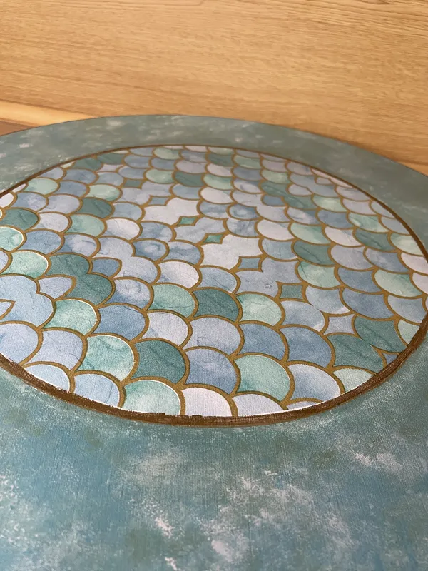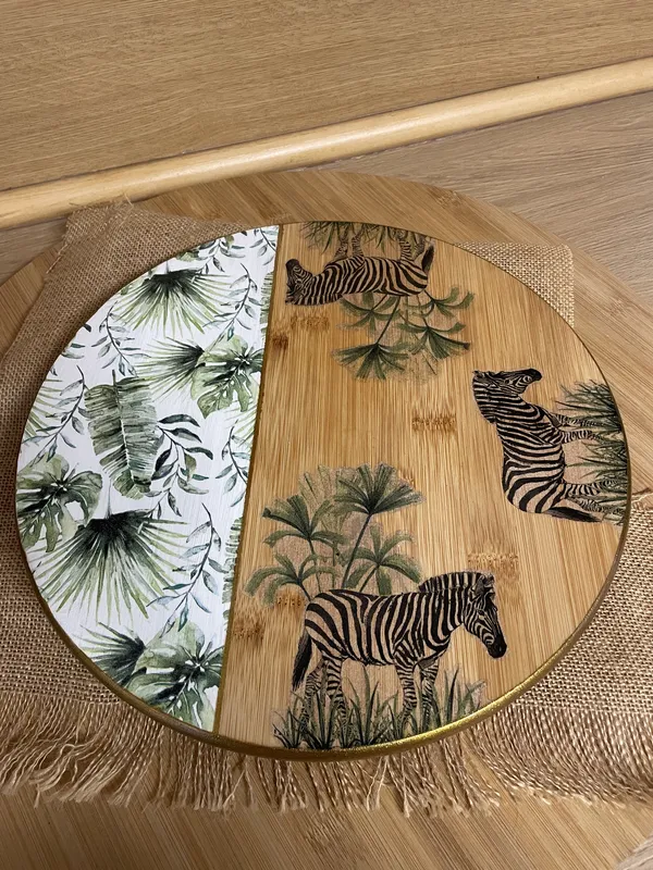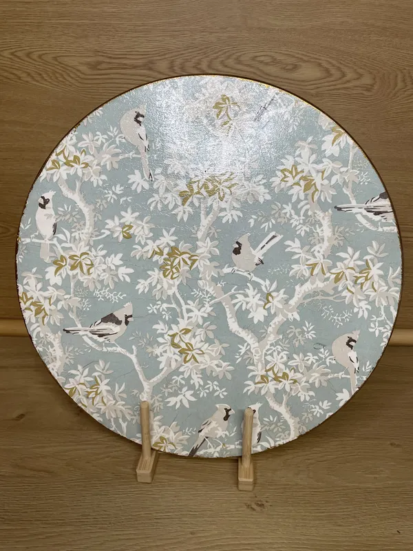 Tabla giratoria XL decorada a mano con la técnica de decoupage. Apto para alimentos y lavado a mano. 50cm de diámetro. Acabado brillante, apto para poner alimentos encima. Personaliza con el diseño que más te guste.